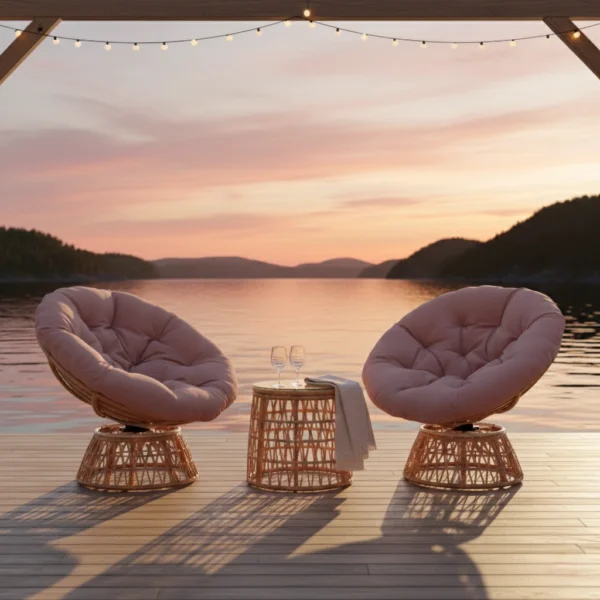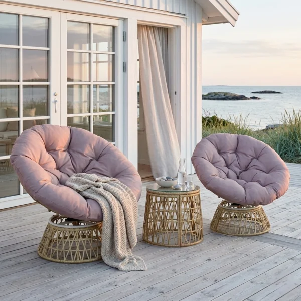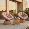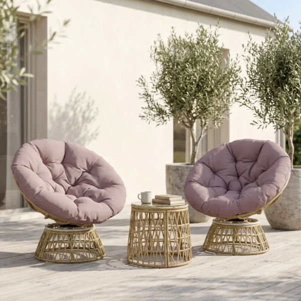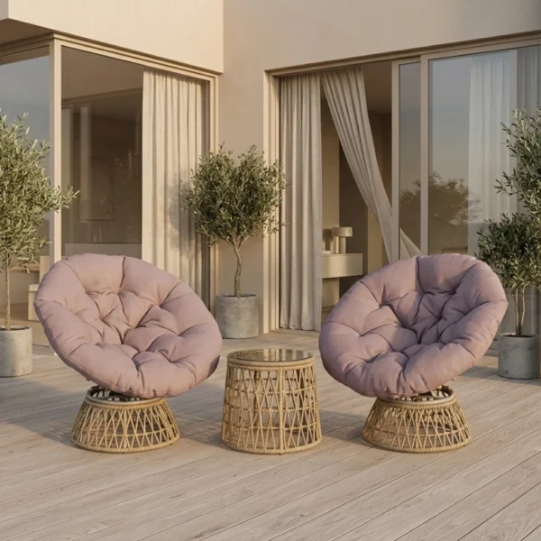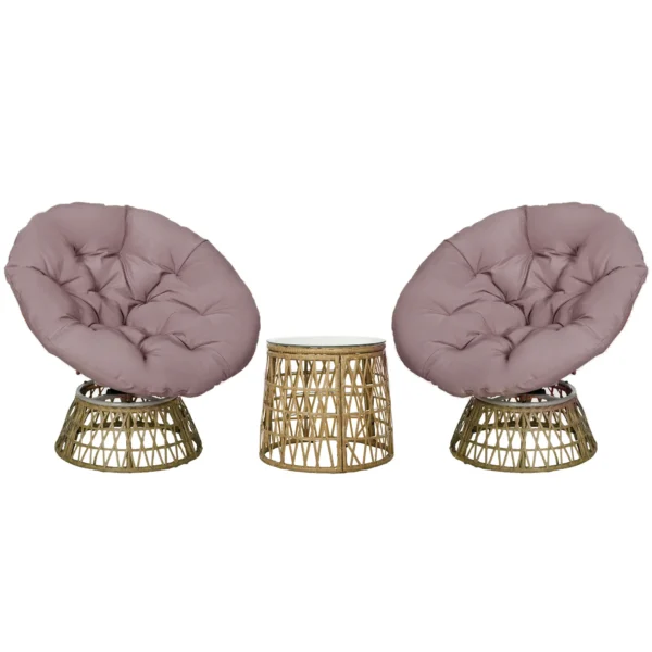 Skapa en inbjudande och avkopplande oas utomhus med detta eleganta 3-delade rotting-bistroset. Setet består av två 360° vridbara rottingfåtöljer och ett stilrent soffbord med härdad glasskiva. De mjuka, tjocka dynorna gör att du sitter bekvämt oavsett om du njuter av morgonkaffet eller umgås med vänner. En perfekt kombination av komfort, funktion och modern design för din uteplats.