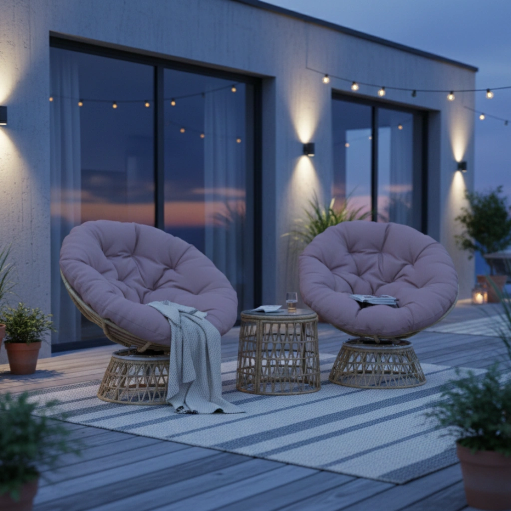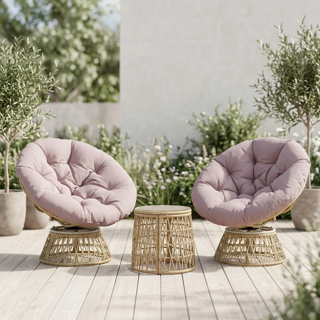 Skapa en inbjudande och avkopplande oas utomhus med detta eleganta 3-delade rotting-bistroset. Setet består av två 360° vridbara rottingfåtöljer och ett stilrent soffbord med härdad glasskiva. De mjuka, tjocka dynorna gör att du sitter bekvämt oavsett om du njuter av morgonkaffet eller umgås med vänner. En perfekt kombination av komfort, funktion och modern design för din uteplats.