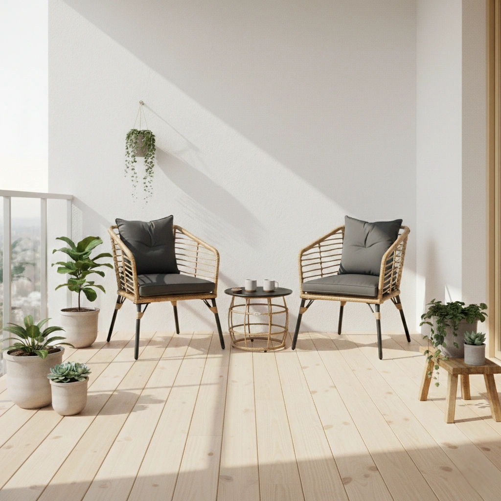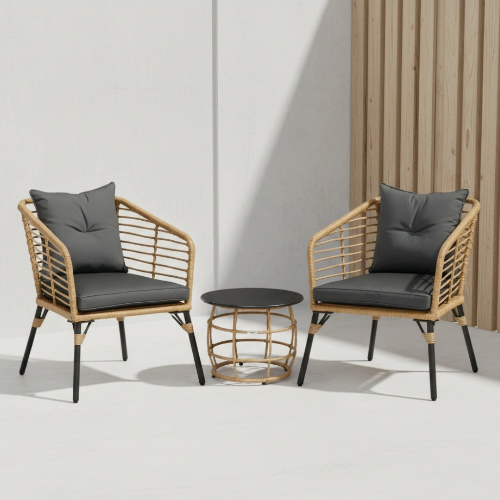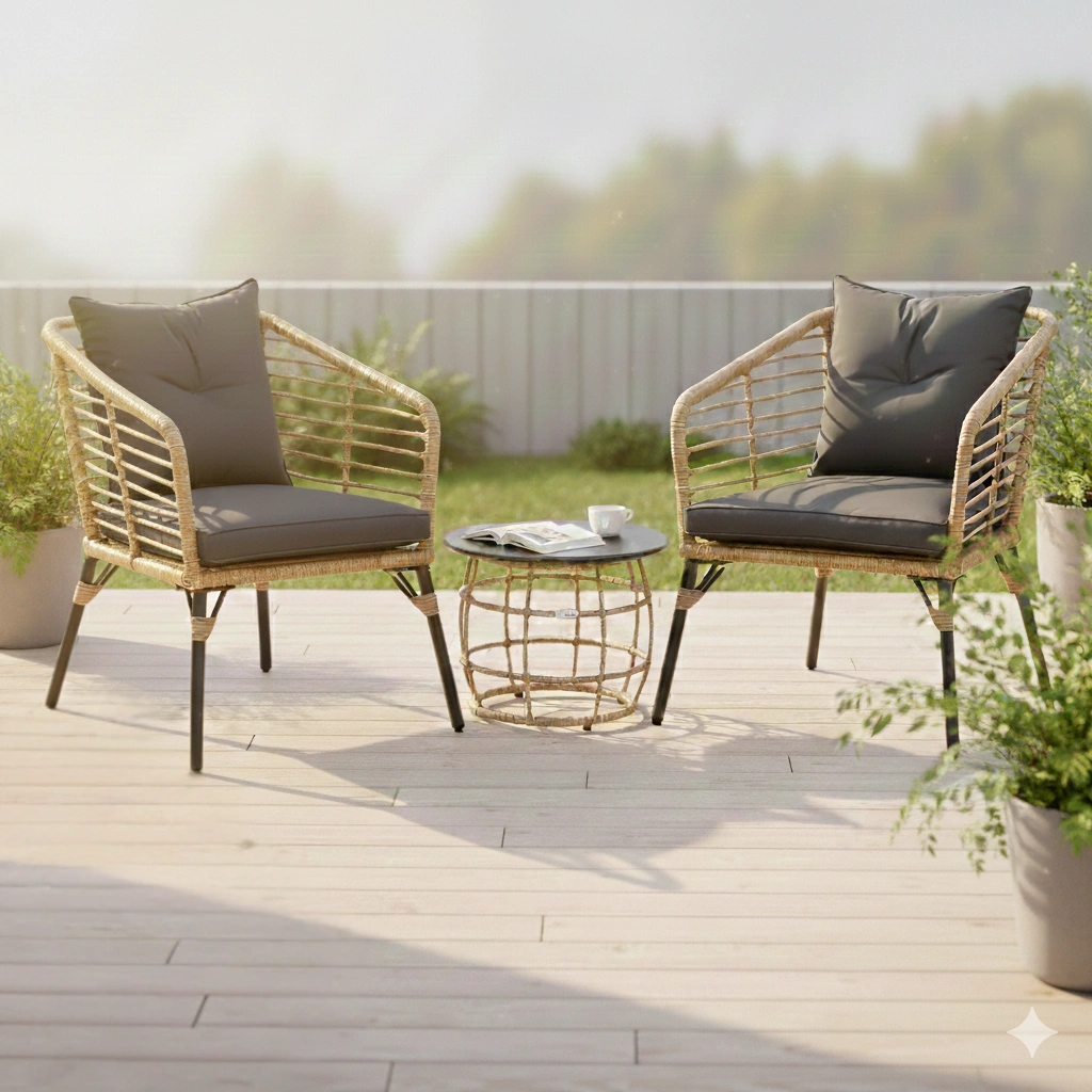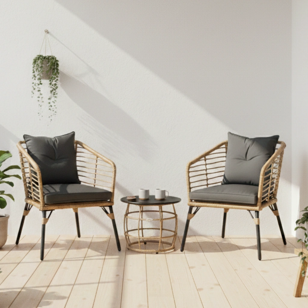 Njut av lugna eftermiddagar utomhus med detta stilrena bistroset. Setet består av två bekväma fåtöljer och ett matchande bord – perfekt för avkoppling, en kopp kaffe eller en stunds samtal med någon du tycker om.