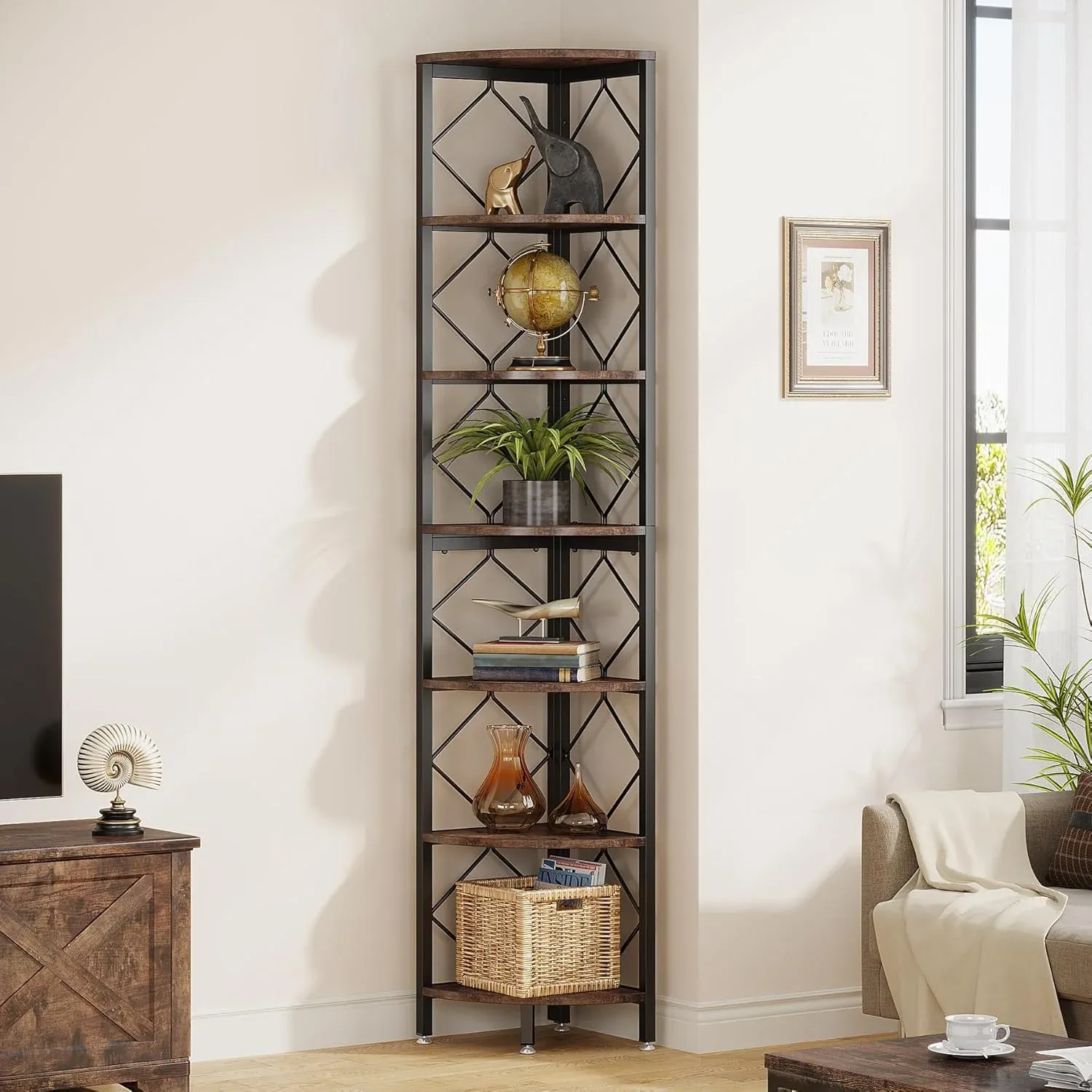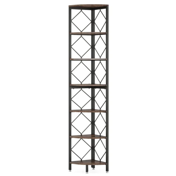 - Hylla med 7 nivåer: Denna hörnhylla har sju hyllplan som ger gott om plats för att visa upp böcker, vaser, hantverk, fotoramar, krukväxter och andra dekorativa föremål.