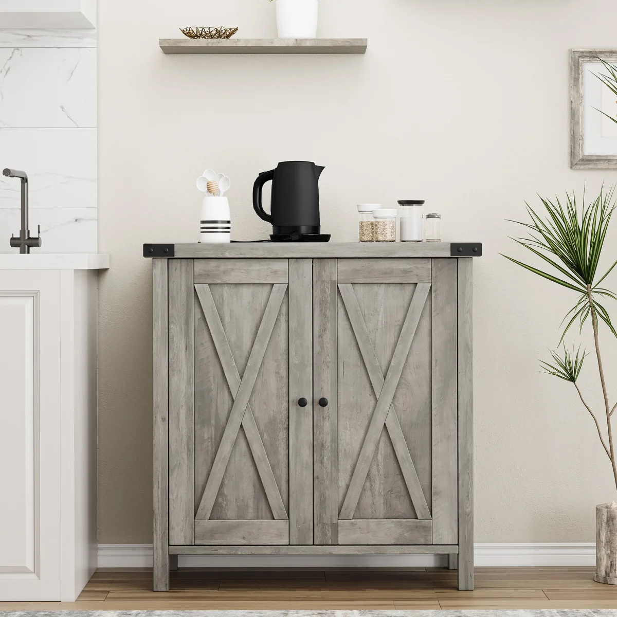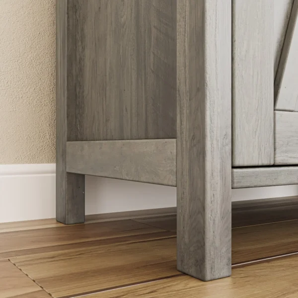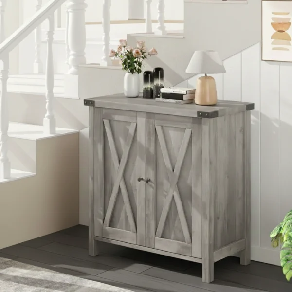 Denna stilrena skänk kombinerar praktisk förvaring med en rustik design som skapar ett varmt och inbjudande intryck. Med sin kompakta storlek och funktionella utformning passar den lika bra i vardagsrum, hall som i kök. Den grå trälooken tillsammans med de dekorativa X-dörrarna ger möbeln ett tidlöst uttryck som smälter in i både moderna och klassiska hem.