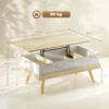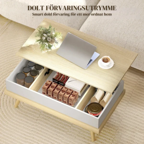 Ett modernt soffbord som kombinerar stilren design med en lyftbar bordsskiva och smart dold förvaring – perfekt för ett mer flexibelt och organiserat vardagsrum
