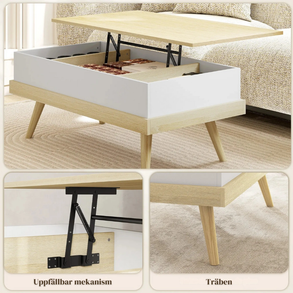 Den upplyftbara bordsskivan kan enkelt höjas upp och framåt för att skapa en bekväm arbetsyta, samtidigt som tre dolda förvaringsfack blir tillgängliga under. Ett perfekt val för dig som vill ha ett mer organiserat och flexibelt hem.