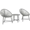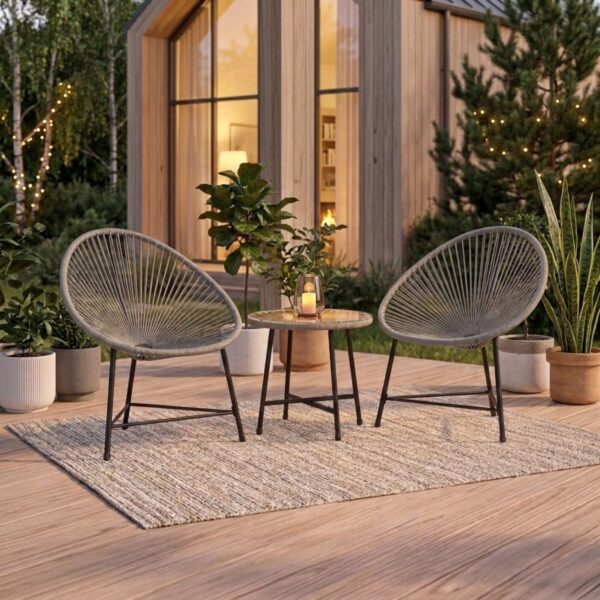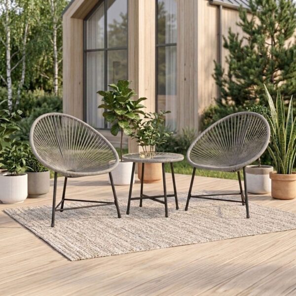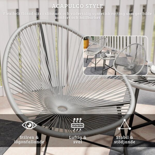 Setet består av två bekväma Acapulco stolar och ett matchande bord med härdad glasskiva – perfekt för morgonkaffet, en lugn stund i solen eller trevliga samtal på balkongen. Den luftiga designen ger ett modernt uttryck samtidigt som sittkomforten är hög.