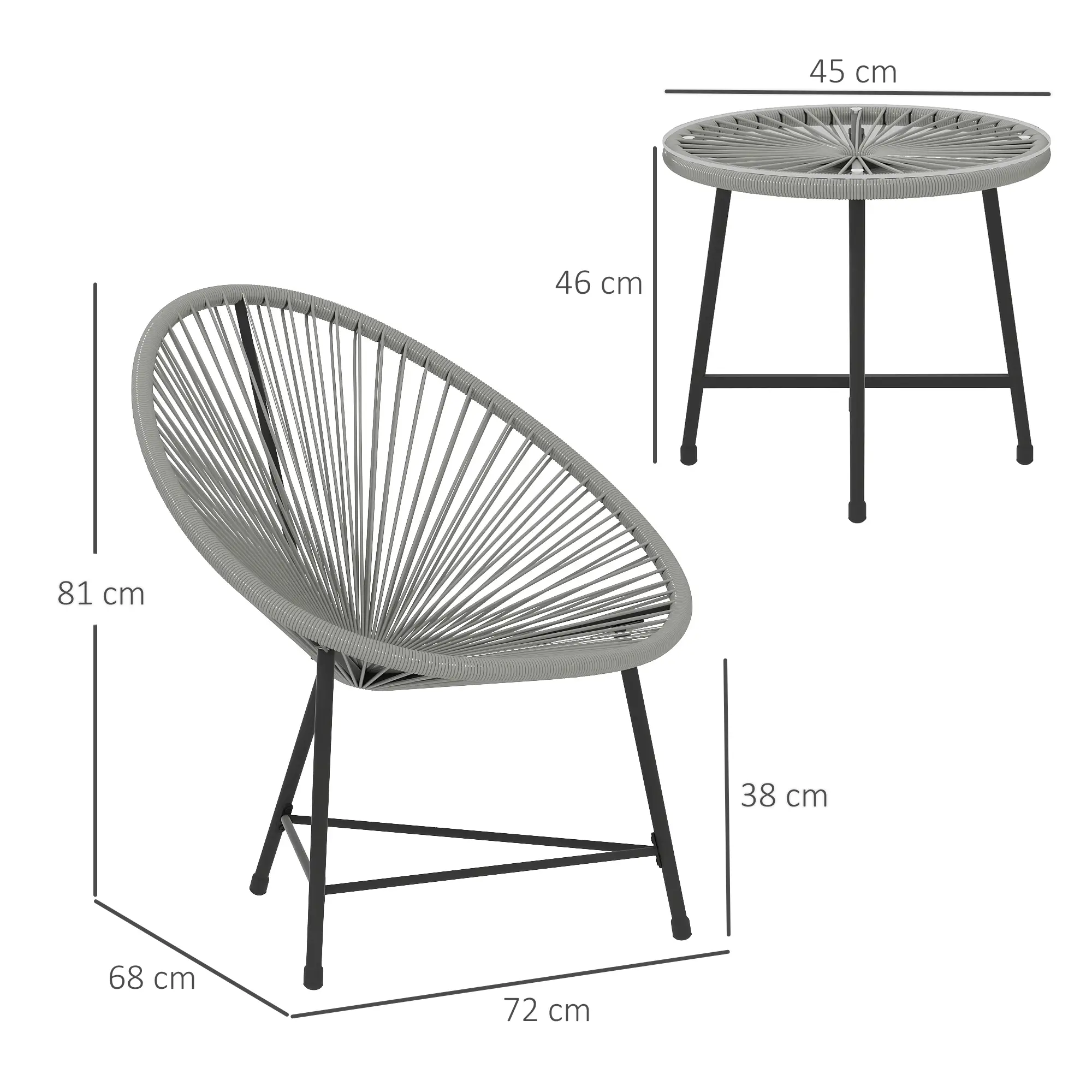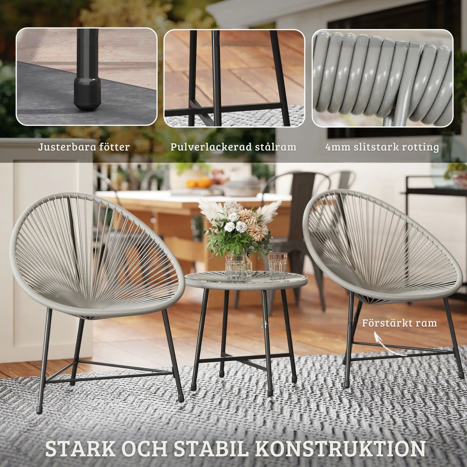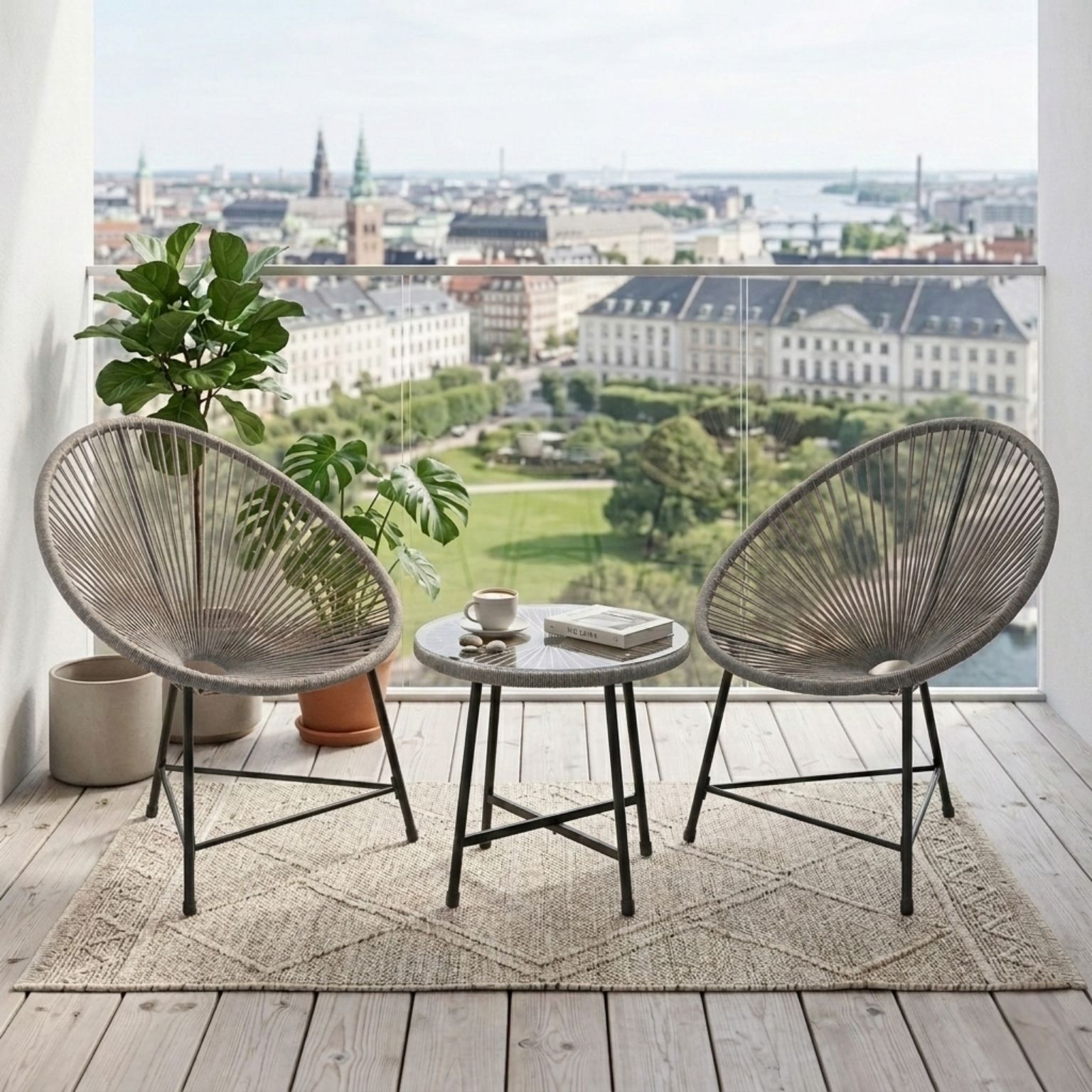 Setet består av två bekväma Acapulco stolar och ett matchande bord med härdad glasskiva – perfekt för morgonkaffet, en lugn stund i solen eller trevliga samtal på balkongen. Den luftiga designen ger ett modernt uttryck samtidigt som sittkomforten är hög.