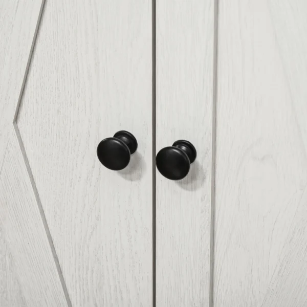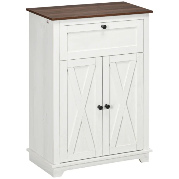Med en kvalitativ bänkskiva, en praktisk låda och ett rymligt skåp med dubbeldörrar får du gott om plats för allt från porslin till vardagsprylar. Den invändiga hyllan är höjdjusterbar och anpassar sig enkelt efter dina behov. Den ljusa färgkombinationen och de dekorativa X-ramsdörrarna ger möbeln ett sofistikerat uttryck som lyfter vilket rum som helst.
