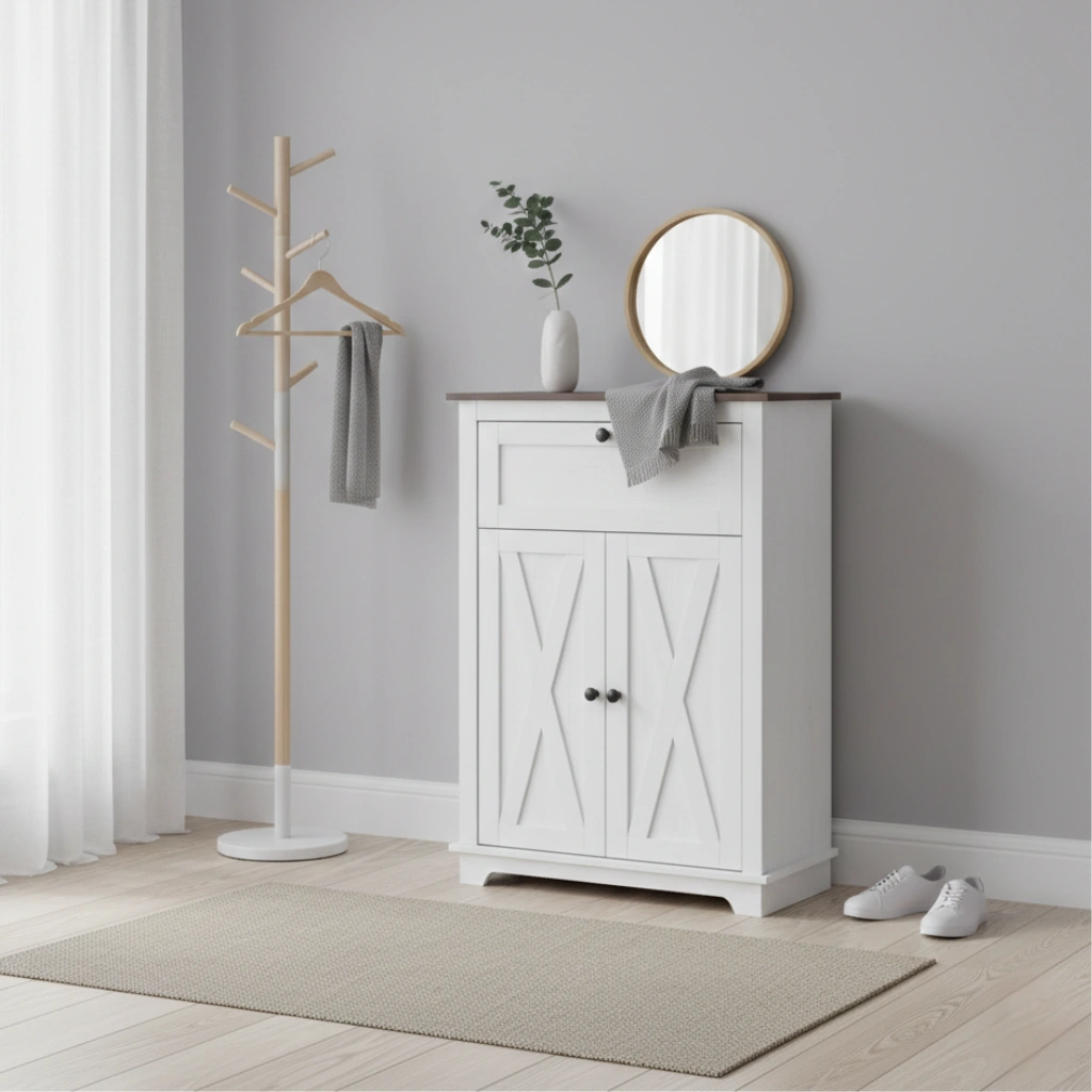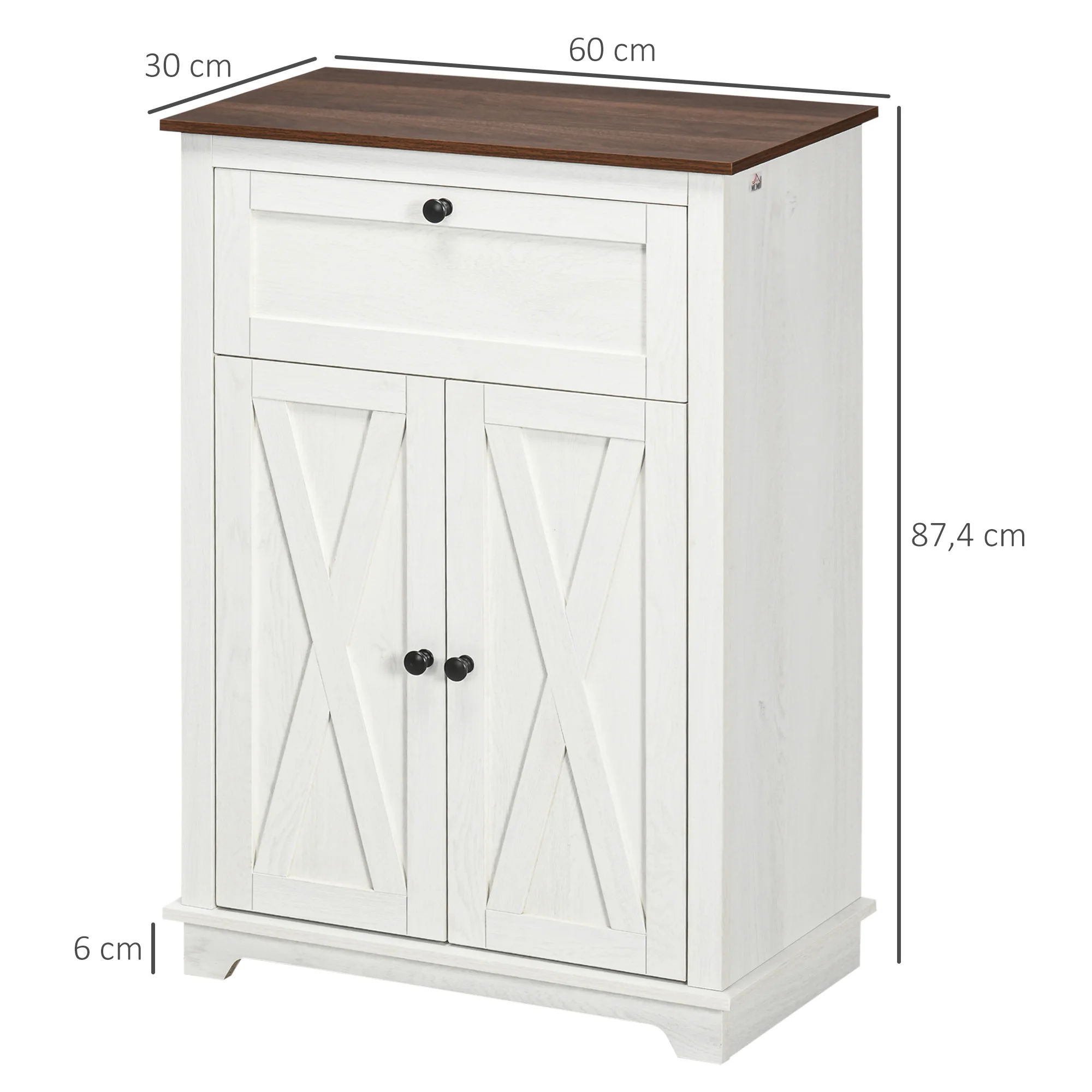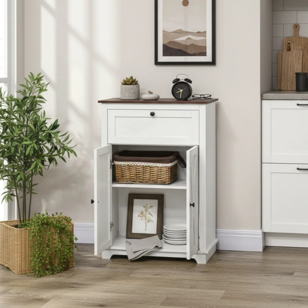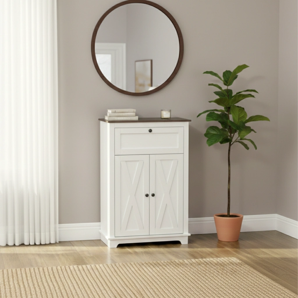 Med en kvalitativ bänkskiva, en praktisk låda och ett rymligt skåp med dubbeldörrar får du gott om plats för allt från porslin till vardagsprylar. Den invändiga hyllan är höjdjusterbar och anpassar sig enkelt efter dina behov. Den ljusa färgkombinationen och de dekorativa X-ramsdörrarna ger möbeln ett sofistikerat uttryck som lyfter vilket rum som helst.