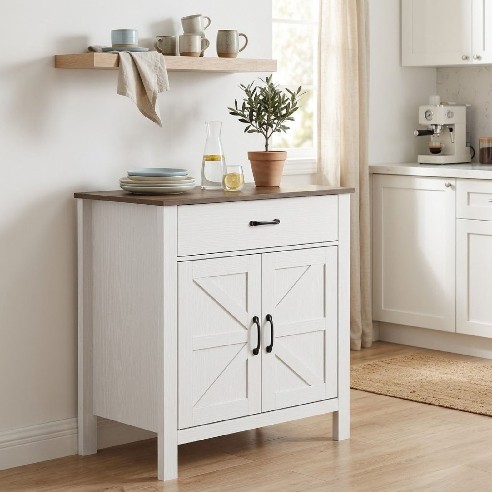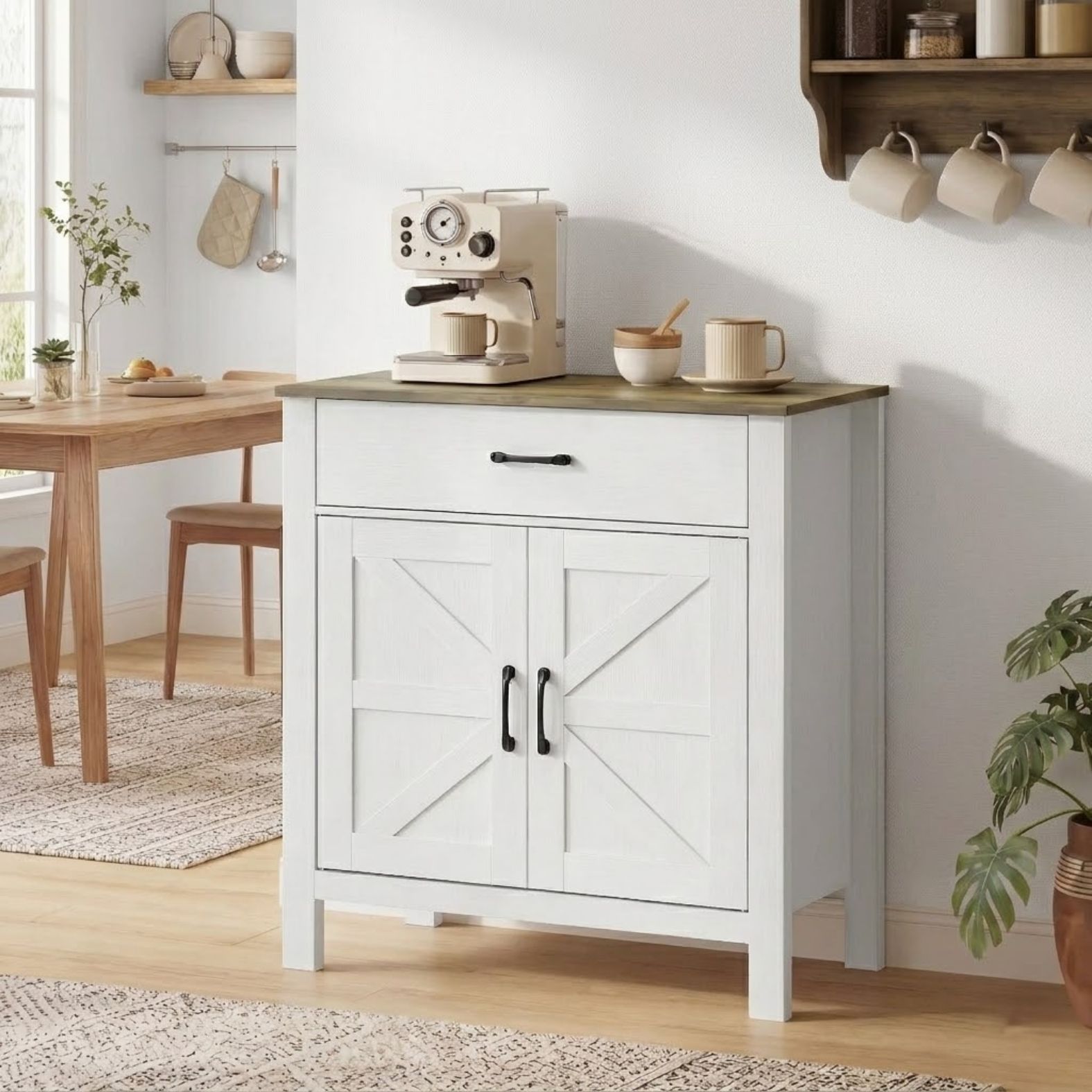 • Smart förvaring: Bred låda och skåp med dubbeldörrar för enkel organisering av porslin och tillbehör