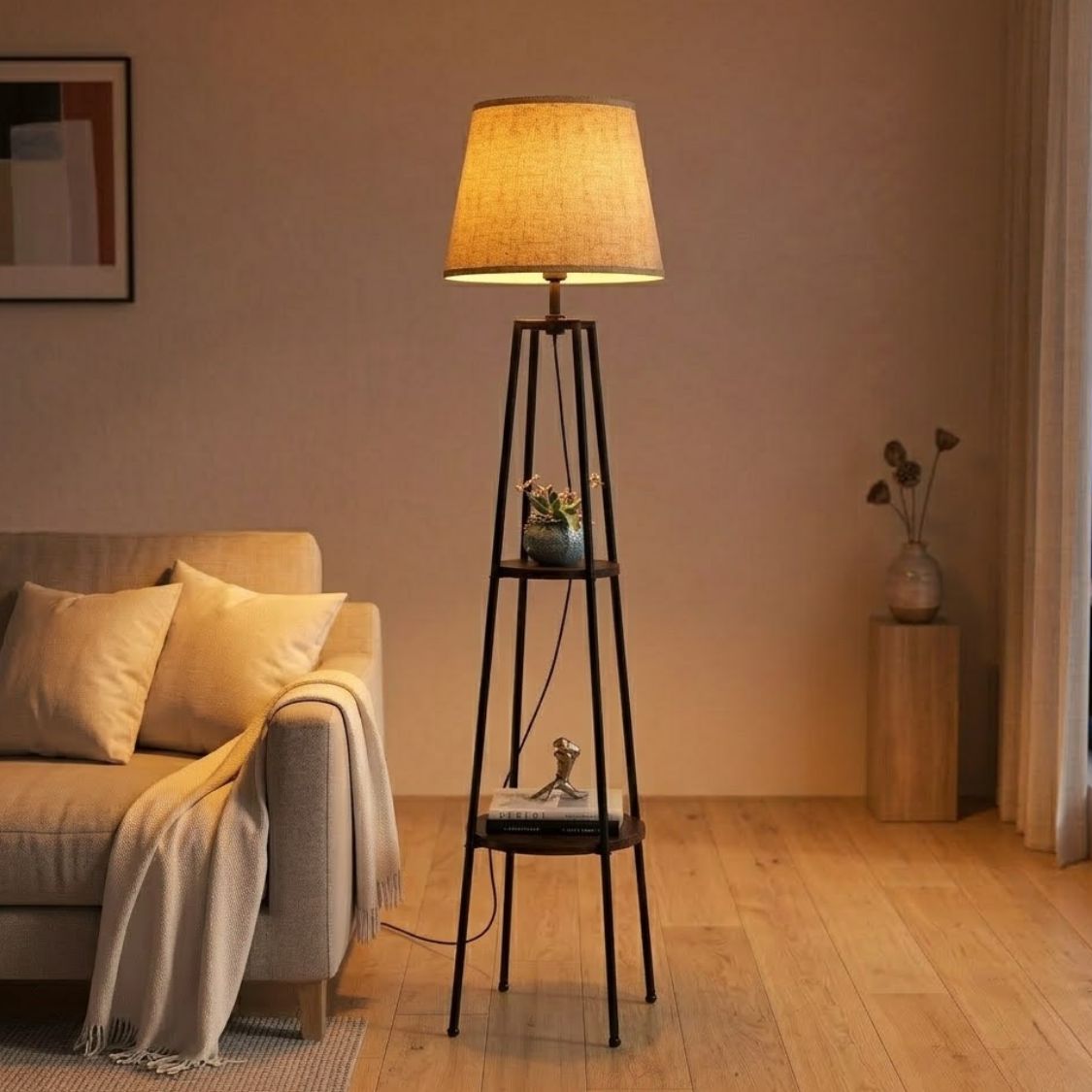 • Modern golvlampa med två integrerade hyllor för praktisk förvaring