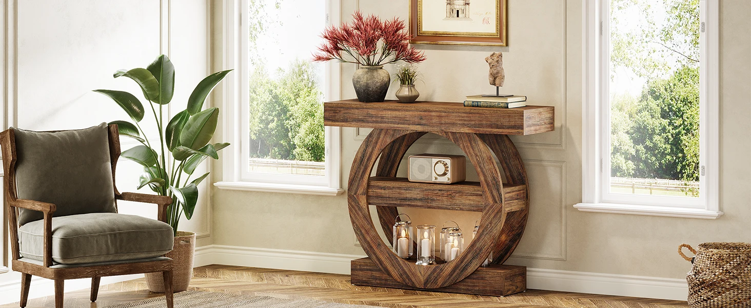 - Stabil och robust design: Byggt för att klara upp till 82 kg har detta lantliga hallbord en stadig bordsskiva på 11,5 cm och förstärkt ram. Justerbara fötter förhindrar att det vinglar, och ett tippskydd ger extra säkerhet.