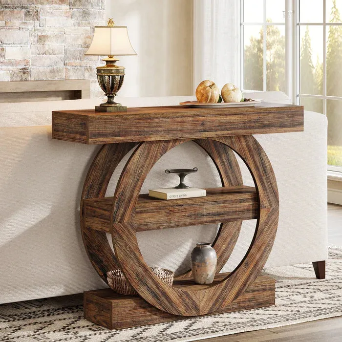 Oavsett om du vill komplettera ditt vardagsrum eller skapa en välkomnande entré tillför detta konsolbord både funktion och ett dekorativt uttryck. Den runda formen ger ett mjukt och balanserat intryck samtidigt som de tre öppna hyllplanen erbjuder praktisk förvaring.