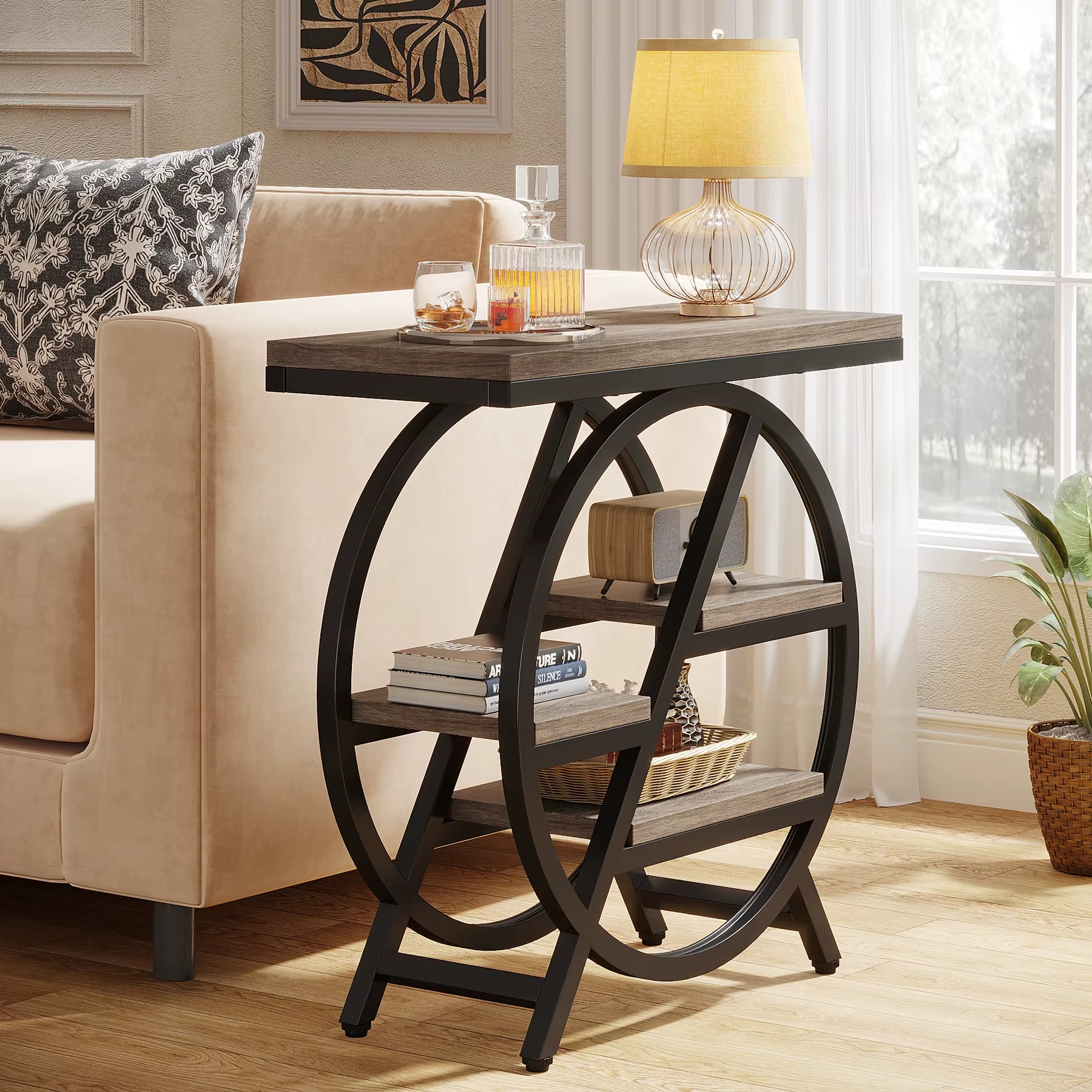 - Sidobordet har tre öppna hyllor för förvaring av böcker, växter och prydnader