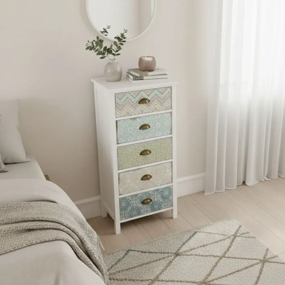 - Genomtänkt förvaring: Fem lådor ger bra plats för kläder, textilier och vardagsföremål – perfekt för att hålla ordning på ett diskret sätt.
